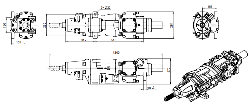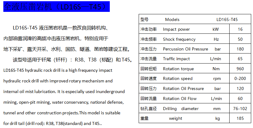 LD16S-T45 液壓鑿巖機是一款改良回轉(zhuǎn)機構(gòu)內(nèi)部油霧潤滑的高頻沖擊液壓鑿巖機,特別應(yīng)用于地下采礦、露天開采、水利、國防、隧道、鑿巖等建設(shè)工程該型號適用于針尾(釬桿) : R38、T38 (標配)和T45