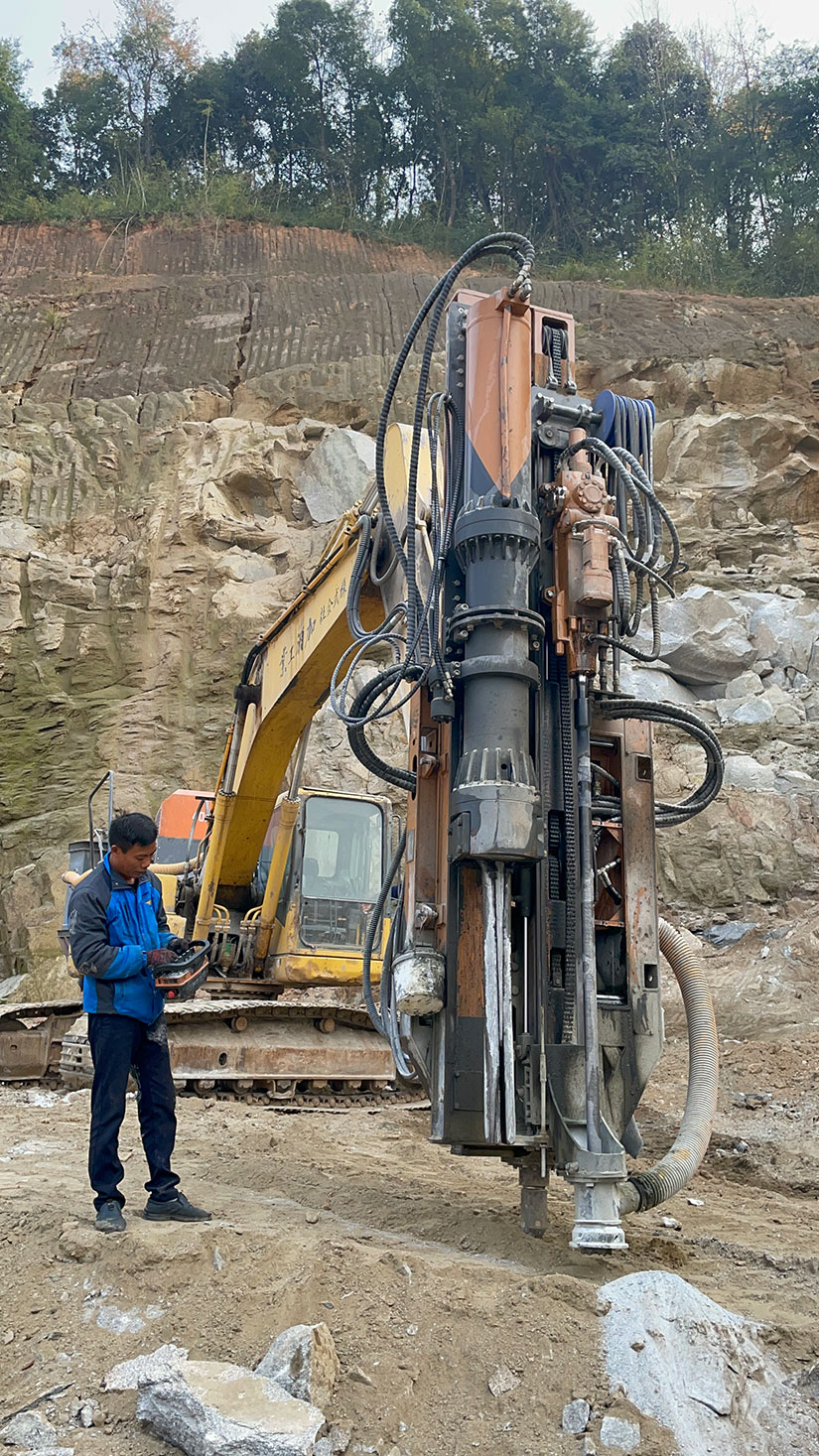 駕駛員在駕駛室操作挖機(jī)后,便可以使用遙控操控一體機(jī)對硬巖進(jìn)行鉆孔、對孔、劈裂等操作...