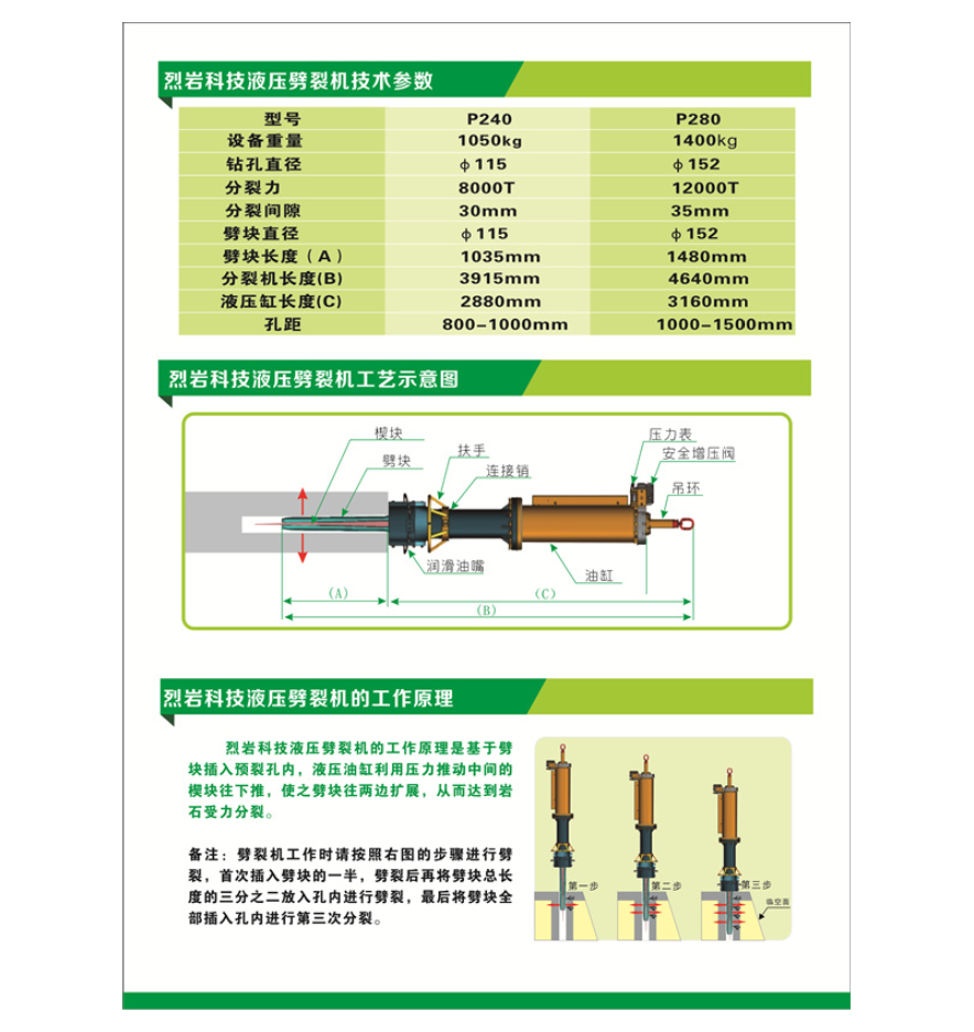 2.液壓劈裂機工作原理:由泵站輸出的超高壓液壓油為工作動力,并經(jīng)機械放大后使被分裂物體按預(yù)定方向裂開。