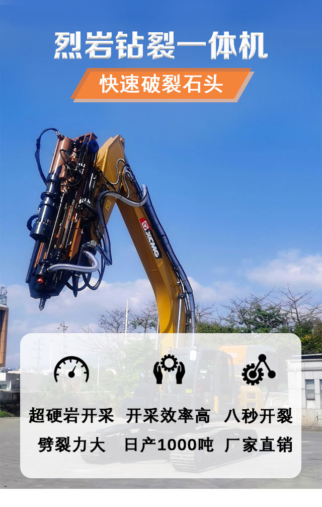 鉆裂一體機是自主研發(fā)的用于劈裂硬質(zhì)巖石的專用設備,擁有多項國家專利,鉆裂一體機與挖機...